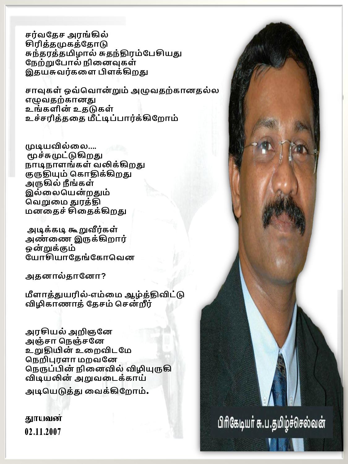 வரலாறாய் வாழும் பிரிகேடியர் சுப தமிழ்ச்செல்வன். November 1, 2015 News தமிழ்மக்களின் அரசியல்சுதந்திரத்துக்காக இருபத்துமூன்று ஆண்டுகள் களத்திலும் அரசியல்தளத்திலும் பணிசெய்தார்பிரிகேடியர் சு.ப.தமிழ்ச்செல்வன் அவர்கள் மரணிக்கும் போது நாற்பது வயதை எட்டியசு.ப.தமிழ்ச்செல்வன் அவர்கள் பதினேழாவது வயதில் ஒருபோராளியாக விடுதலை இயக்கத்தில் இணைந்து கொண்டு தனது இருபத்துநான்காவது வயதில் செயல்திறன்மிக்கவிடுதலை இயக்கத்தின் அரசியல்துறைப்பொறுப்பாளர் என்றபொறுப்பை ஏற்றதிலிருந்து அவர்மரணிக்கும் வரையான பதினான்குஆண்டுகளாகத்தனது பணியை செவ்வனேநிறைவேற்றியுள்ளார். பிரிகேடியரைப்பொறுத்தவரையில் அவரைமிகவும் நேசித்த தேசியத்தலைவர்பிரபாகரன் அவர்களால் யதார்த்த பூர்வமான சிந்தனையையும், செயலையும் புடம் போடக்கூடிய செயலினூடாக அறிவுபூர்வமாகவளர்க்கப்பட்டார். அதனால்தான் பிரிகேடியரால் சமகாலத்தில் அரசியல்ரீதியாகவும் படைத்துறைரீ தியாகவும் செயற்படமுடிந்தது. அத்தோடு அவரது ஆற்றலானது செயல்பூர்வ அறிவாகமிளிர்ந்தது. அரசியல் ரீதியில் தமிழ்மக்களின் விடுதலைகுறித்து ஒரு எத்தனிப்பைசெய்து கொண்டு படைத்துறை ரீதியாகபலம் பெறுவதொன்றே தமிழ்மக்களின் விடுதலையை செயல்பூர்வமானதாக்கும் என்ற தேசியத்தலைவர் அவர்களின் விடுதலைச்சிந்தனையை அனைத்துலகமேடைகளில் அவரால் உறுதியுடன் முன்கொண்டுசெல்ல முடிந்தது.