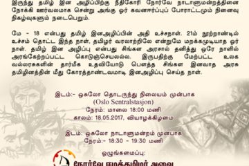 நோர்வேயில் தமிழின அழிப்பு நாள் May 15, 2017 Uncategorized இரத்தவெறி பிடித்த அரச பயங்கரவாதம் தன் கோரப்பற்களால்...
